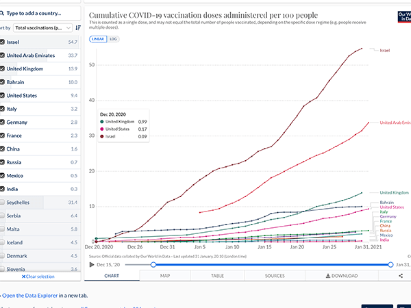 As I have pointed out, Israel is well ahead of the rest of the World in vaccinating its population. However, they have been widely criticised because in the West Bank the vaccine is only being distributed to Jewish settlers and not to the roughly 2.7 million Palestinians living around them. It seems very unlikely to me that the Israelis will be rushing to donate vaccine doses to Covax. In the UK, for the political reasons mentioned above, I think Boris Johnson and his despicable crew are unlikely to want their only domestic success story of the past year to be knocked off track by mere altruistic considerations. They will, instead, point out the fact that the UK has helped raise more than £730 million for the Covax advance market commitment, including £548 million in UK aid, to help distribute 1.3 billion doses of coronavirus vaccines to 92 developing countries this year. In the USA, Biden is just starting to wrestle with the COVID-19 chaos that Trump allowed to develop, as well as trying to build bridges with the “America First” brigade. I think he would find it to be a “hard sell” to the US population that they should pause their vaccination program once they have inoculated at risk groups. I don’t know a lot about the UAE and Bahrain, but my gut feeling is that neither of them would be rushing to take the global moral high ground.